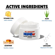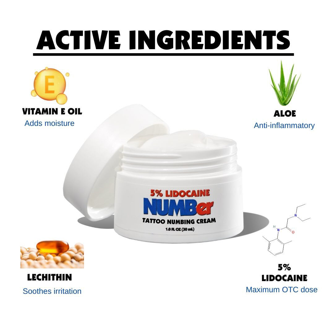 NUMBer™ 5% Lidocaine Cream, with Vitamin E, Aloe Vera and Lecithin, is a non-prescription topical anesthetic product that provides pain relief during tattooing, laser hair removal, Brazilian waxing, microneedling, microblading, Botox, injections, anorectal procedures, and PMU (permanent makeup).